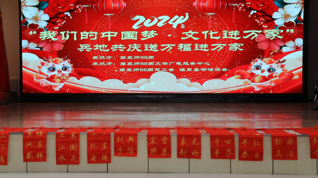 岁末年初,春节将到。写春联、贴福字是民间的传统习俗。为深入学习宣传贯彻党的二十大精神,营造欢乐祥和的春节氛围,丰富“兵地”两地职工群众的精神文化生活,增强群众的幸福感和获得感,1月31日,八十八团举办“我们的中国梦——文化进万家”兵地共庆送万福、进万家活动。来自两地干部、职工群众共40余人参加了活动。