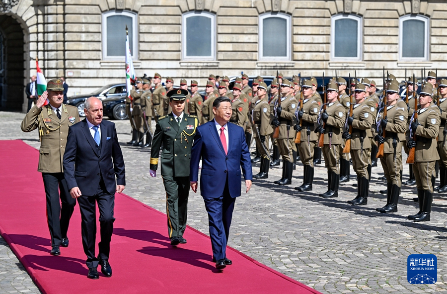 当地时间5月9日上午,国家主席习近平在布达佩斯出席匈牙利总统舒尤克和总理欧尔班共同举行的隆重欢迎仪式。