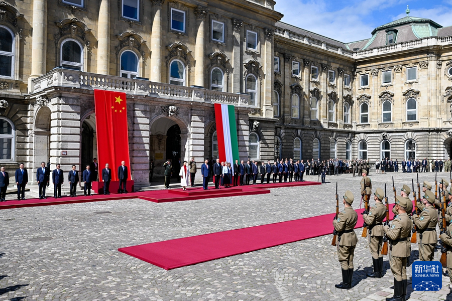 初夏时节的布达佩斯阳光明媚,古老宏伟的布达王宫庄严矗立,中匈两国国旗相映成辉。