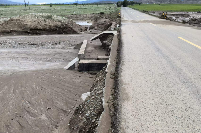 5月26日傍晚时分,88团Z568线因连续强降雨引发山洪泥石流灾害,造成Z568线K7-K9路段的路基、路肩边坡严重损毁,损毁面长约90米、深约3.5米。严重影响到附近居民出行以及车辆行驶安全。