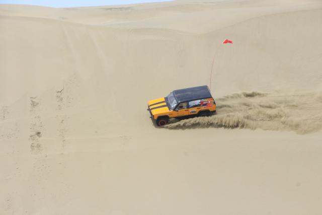 在木特塔尔沙漠60多度十几米高的沙坡上百余名赛车手陆续出发,马达的轰鸣声响彻沙漠上空。随着裁判员发令旗落下,参赛车辆两两一组,如离弦之箭,竞相飞驰在赛道上。加速、转弯、漂移,充分体现了赛车手娴熟的技术水平,在金黄的沙漠中划出一道道优美的弧线,上演沙漠版“速度与激情”,让现场观众心潮澎湃。