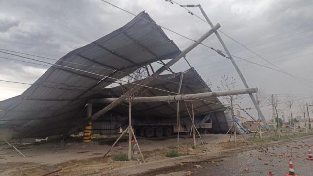 2024年6月30日夜晚,五师老工业园区一废品收购站重达3吨的彩钢大棚被大风刮起,冲撞在35千伏中大线路上,造成18号排杆被撞断,导致35千伏大莲湖变电站停电,严重影响86团南区部分连队农业生产、居民生活用电。