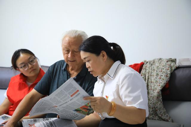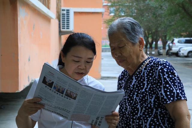 社区工作人员和大学生志愿者来到九十一团老年活动中心、小区休闲区、居民家中为老年人开展读报活动,传达时事新闻、科普知识。社区工人人员还以通俗易懂的语言、要点式知识向居民们传达党的二十届三中全会精神。