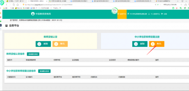 第一步,登录中国教师资格网(www.jszg.edu.cn)—“网上办事”—“中小学教师资格定期注册”右侧的“在线办理”进行注册。