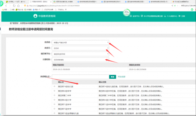 11月18日至19日第五师双河市教育局对报送的申请材料进行初审并在教师资格管理信息系统做出注册结论建议,如注册合格、暂缓注册或注册不合格。联系人及方式:马娟娟 2269263