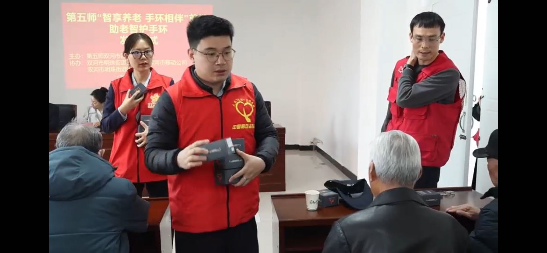 活动现场气氛热烈而温馨,考虑到老年人接受新事物可能存在一定难度,双河市移动公司的工作人员通过视频展示的方式,为老人们详细讲解智能手环的使用方法。工作人员们耐心十足,一步一步地演示,从如何佩戴手环,到各项功能的操作,如紧急呼叫、健康监测等,都进行了深入浅出地讲解。老人们聚精会神地聆听,时不时提出问题,工作人员也都一一耐心解答。