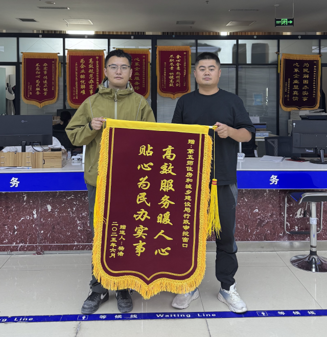 近日,新疆泰华房地产开发有限公司的工作人员杨浩将一面绣有“高效服务暖人心,贴心为民办实事”的锦旗送到师市政务服务中心住建窗口工作人员手中,对该窗口全程协助办理施工许可证、预售许可证、网签合同备案,高效解决企业难题表示衷心感谢。
