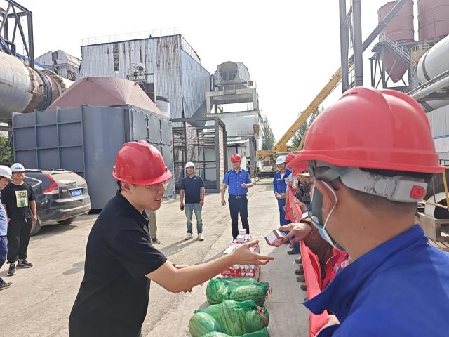 活动中,师市人社局、住建局工作人员赴新疆普耀新型建材有限公司、御景尚都二期建设项目等一线场所,将精心准备的西瓜、矿泉水、藿香正气水等防暑降温物资送到农民工手中;同时向他们发放政策宣传页,工作人员现场讲解劳动保障相关法律法规政策,张贴维权二维码,引导依法维权,让农民工群体合法保障自身权益。每到一处,工作人员都与农民工亲切交谈,详细询问他们的工作时间、高温作业防护措施以及工资发放等情况,叮嘱大家在高温天气下作业时一定要注意劳逸结合,做好自身防护,确保安全健康。