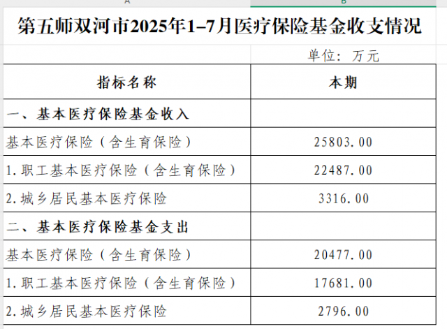 第五师双河市2025年1-7月医疗保险基金收支情况