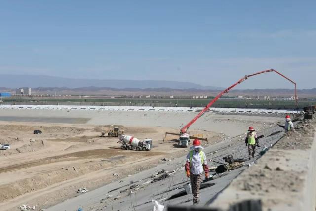 该项目负责人赵涛站在总库容达990万立方米的水库坝坡上,仔细查看坝坡聚氨酯防护涂料喷涂情况。有着13年水利施工经验的赵涛,此时衣服背后早已析出层层盐晶,像极了戈壁滩上风化的岩盐。