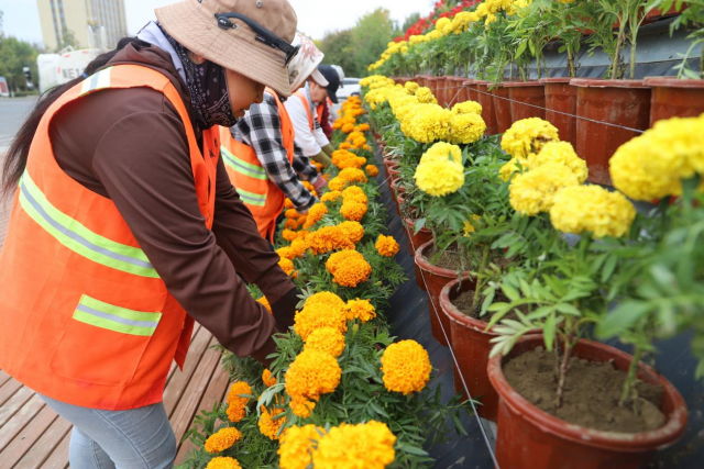 二是绿化修缮添新彩,城市颜值再提升。为以整洁优美的城市环境迎接庆典,市政公司全面启动城区绿化景观升级行动。组织40余人对各公园、道路绿化带的植被进行全面梳理,修剪杂乱树枝、清除杂草落叶,对老化枯萎的绿植及时更换补植,累计完成绿化修缮面积达5000余平方米。与此同时,在光明路、军垦路、孵化中心等重要交通节点打造主题花卉景观,选用串串红、以及红黄菊花等色彩艳丽的花卉,精心搭配出各样的造型别致的花境,共栽种各类花卉27000余株,姹紫嫣红的花卉与周边绿植相映成趣,为城市披上喜庆的“盛装”。