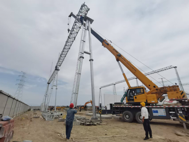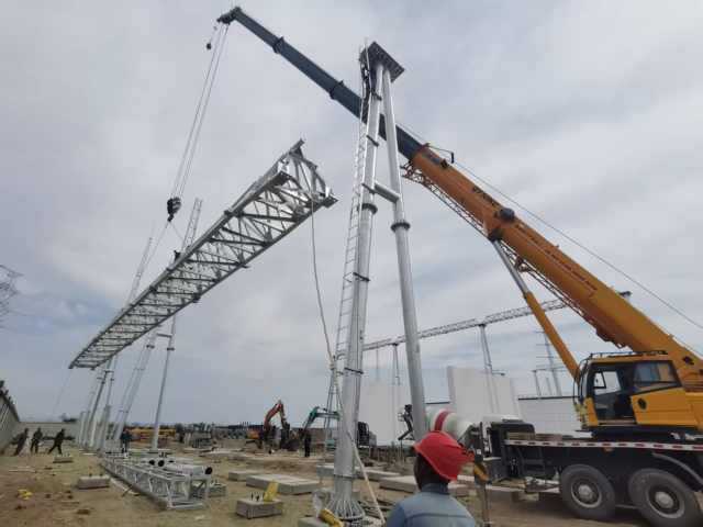 据悉,此次安装的构架梁单组跨度达24米、重量超6吨,需依赖50吨大型吊车作业,且对吊装精度、现场协调要求极高。为确保任务安全高效推进,该中心提前谋划,前期联合施工单位开展现场勘察,结合设备参数与场地条件制定3套专项吊装方案,施工前明确人员分工,设置吊装指挥、安全监护、技术保障3个专项小组,细化吊车走位、吊点固定、梁体对接等关键环节操作流程。在吊装当日,现场总指挥通过对讲机实时调度,吊车精准起吊,操作人员密切配合调整梁体角度,安全监护人员全程紧盯吊索受力、周边环境,安装作业人员整体协同,经过8小时连续作业,顺利完成4组构架梁的平稳吊装与精准对接,安装误差控制在设计范围内。