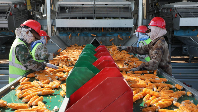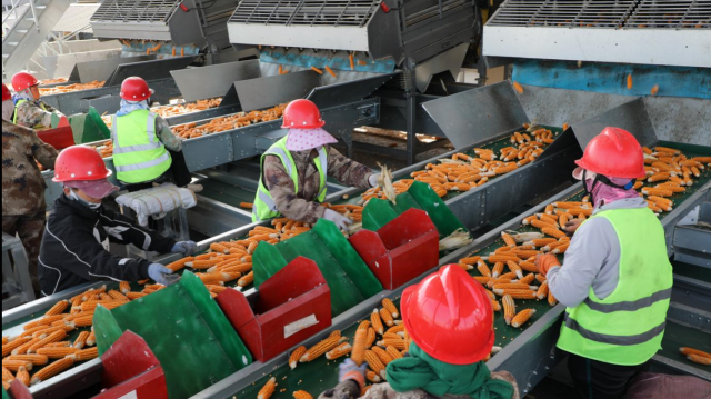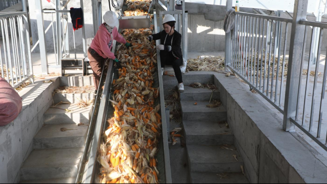 新疆西海田园农业发展有限公司董事长闫军说:我们这个厂子是团里面招商引资项目,从去年建厂,今年生产是9月上旬开始生产的。年加工量是两万吨果穗玉米,每天加工籽粒这一块应该是400吨左右。今年生产1万亩地,应该在10月上旬就全部结束。
