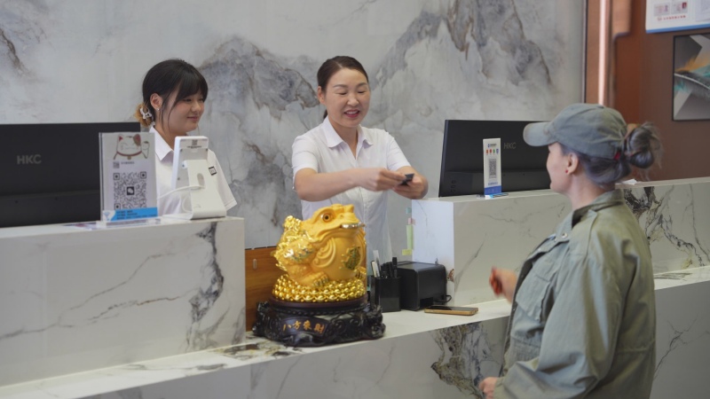 近日,记者走进位于89团的双河豪锦酒店看到,游客们正在办理退房手续。