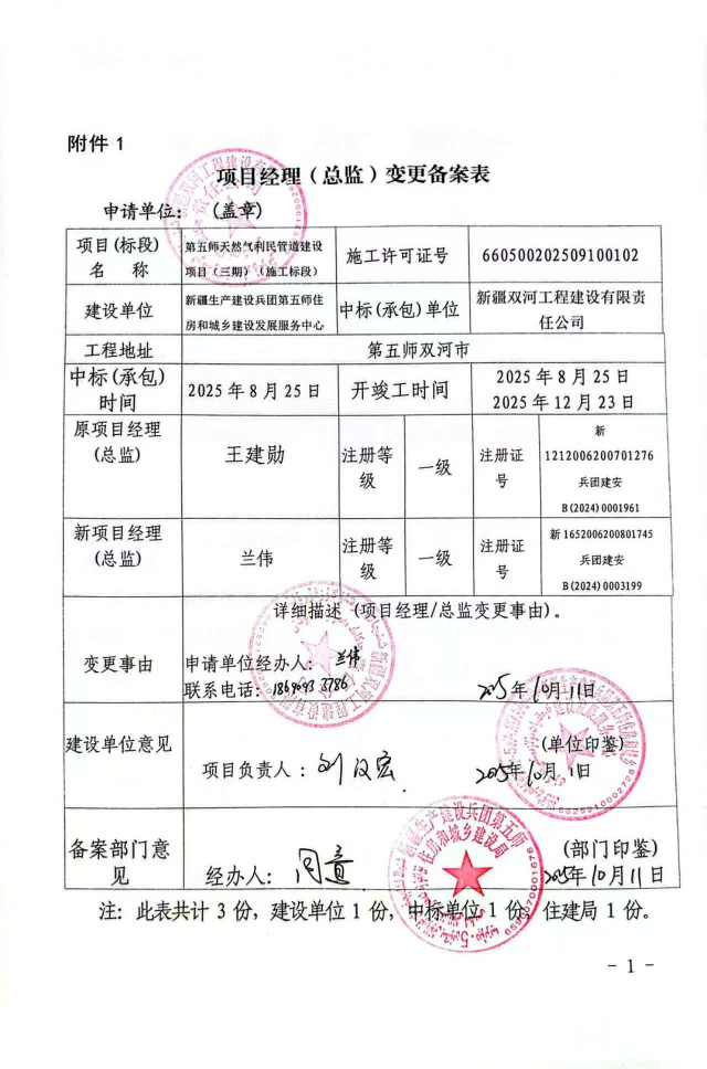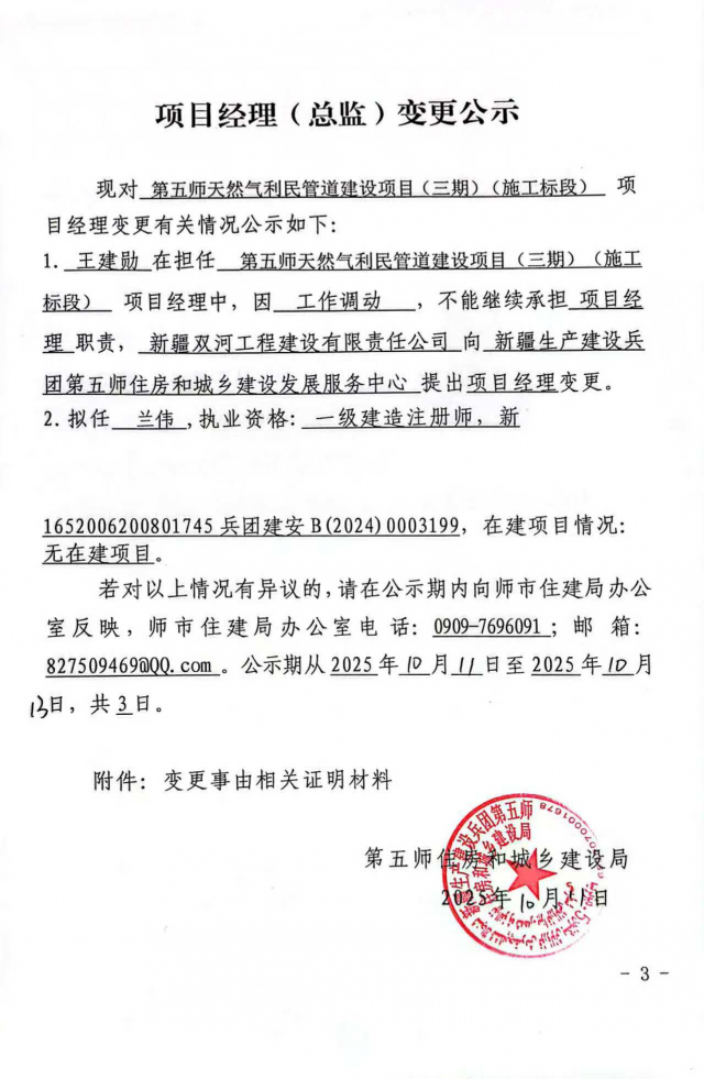 第五师天然气利民管道建设项目(三期)项目经理变更公示