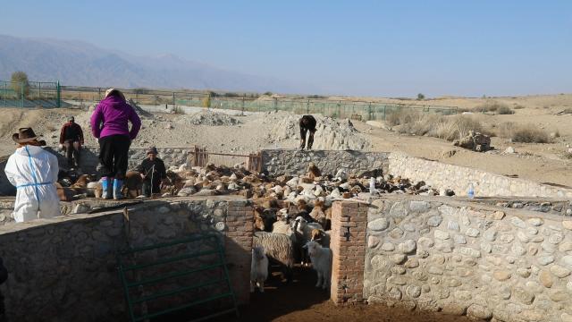 在88团养殖片区的药浴点可以看到,工作人员早已忙碌起来。大家分工协作,有的引导养殖户有序赶运羊只,避免羊群拥挤应激;有的则用带叉的工具在浴池两旁控制羊只前行速度,仔细观察每一只羊的药浴情况,确保羊头部能够完全浸入药液中,停留大约2分钟,使羊全身充分浸透药液,然后让羊游出药浴池。