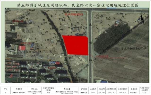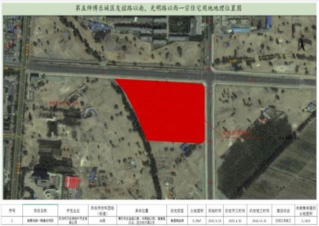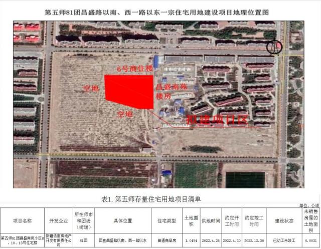 5 | 第五师81团昌盛南苑小区8、10、13号住宅楼 | 新疆浩宸房地产开发有限责任公司 | 81团 | 团直昌盛路以南、西一路以东 | 普通商品房 | 1.0494 | 2022.4.26 | 2022.4.30 | 2023.12.30 | 已动工未竣工 | 0.0031 |