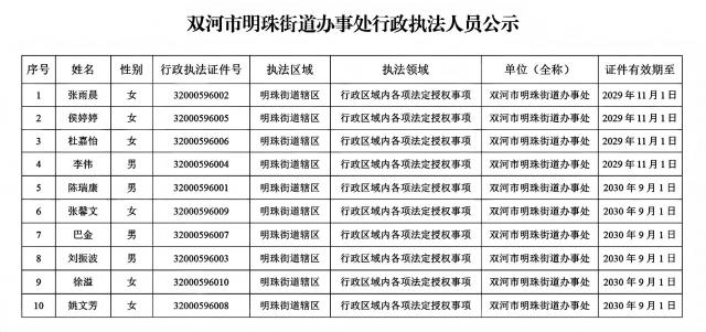 双河市明珠街道办事处行政执法人员公示