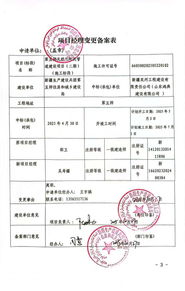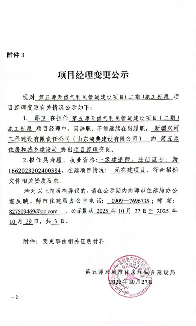 第五师天然气利民管道建设项目(二期)项目经理变更公示)