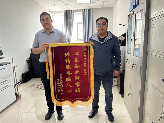 近日,双河工建腾龙分公司企业负责人带着一面印着“心系企业解难题,倾情服务暖人心”的锦旗来到第五师双河市人社局,将这份真挚的感谢送到工作人员董玉豪手中,以此感谢他凭借专业的政策解答、高效的调解工作,成功化解矛盾所展现出的担当之举。