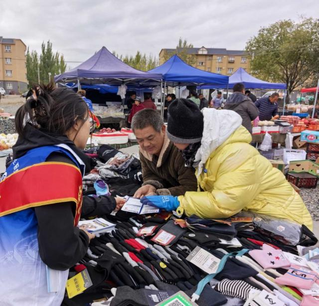 在86团热闹非凡的集市上,新鲜果蔬的香气与特色小吃的味道交织弥漫,摊位前人来人往,叫卖声、谈笑声此起彼伏。在这片熙熙攘攘之中,一群身着“社保蓝”的工作人员格外亮眼,他们支起“高质量参保智慧化服务”的横幅,迅速在集市一角搭建起社保政策宣传的“小阵地”,一场别开生面的社保服务活动就此拉开帷幕。