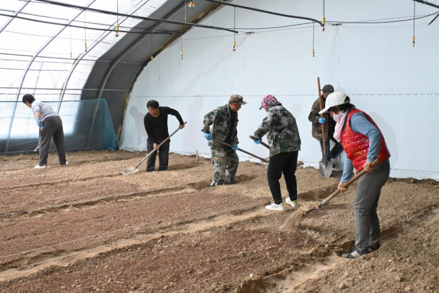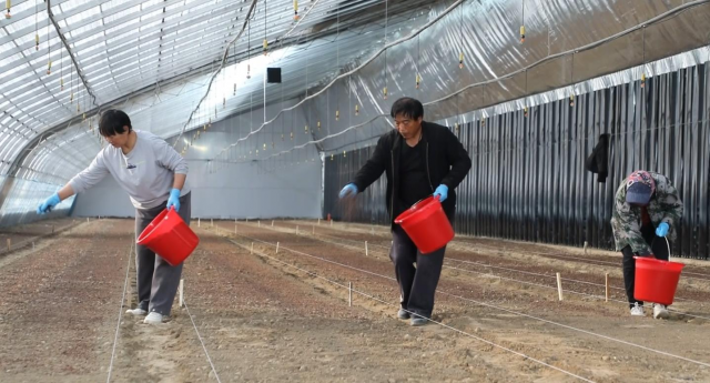 在八十一团五连设施大棚内,记者看到一片忙碌景象,在大棚门口空地处,羊肚菌种子被分装进塑料桶,棚内土地分成田垄,工人们正将羊肚菌菌种均匀地播撒在经过精细处理的菌床上。随后,技术人员与职工们默契配合,在种子上均匀地覆盖土壤,为保证羊肚菌存活率,土壤覆盖达到5厘米厚度。