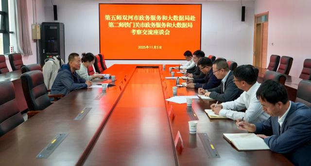 深秋时节,情谊绵长。11月5日,第五师双河市政务服务和大数据局局长吴长华一行赴第二师铁门关市政务服务和大数据局开展考察调研,这是继2024年11月以来两地政数部门的第二次实地牵手,既是友好共建情谊的延续升温,更是深化业务协同、共促政务服务提质增效的务实之举。第二师铁门关市政务服务和大数据局党组书记、局长陈剑锋全程陪同考察并主持座谈。