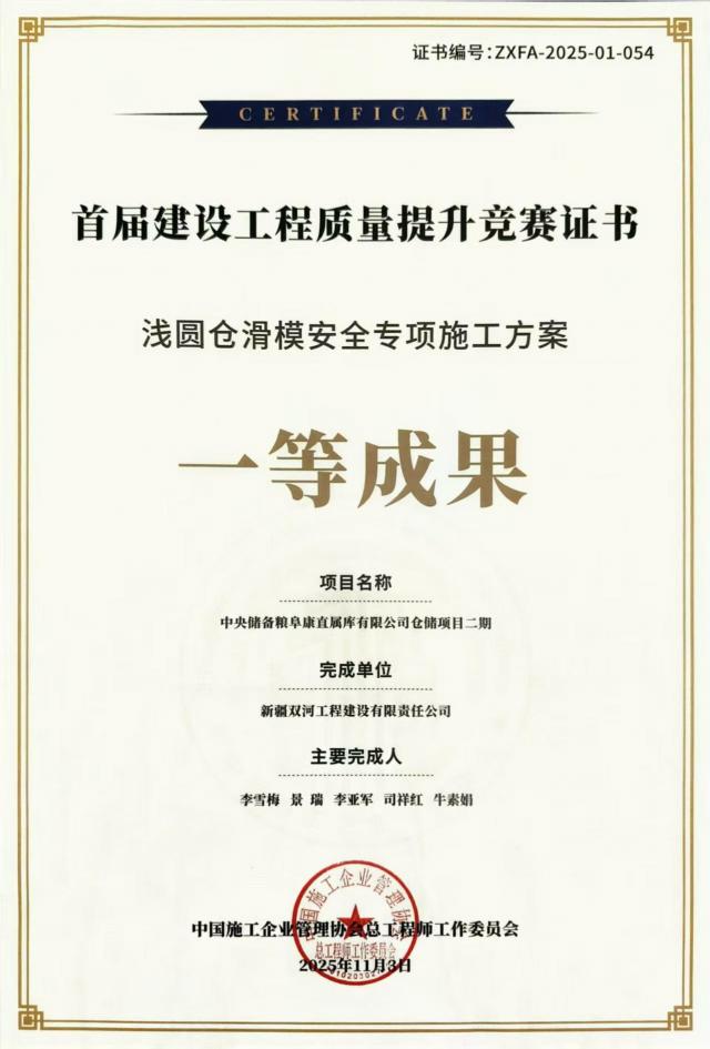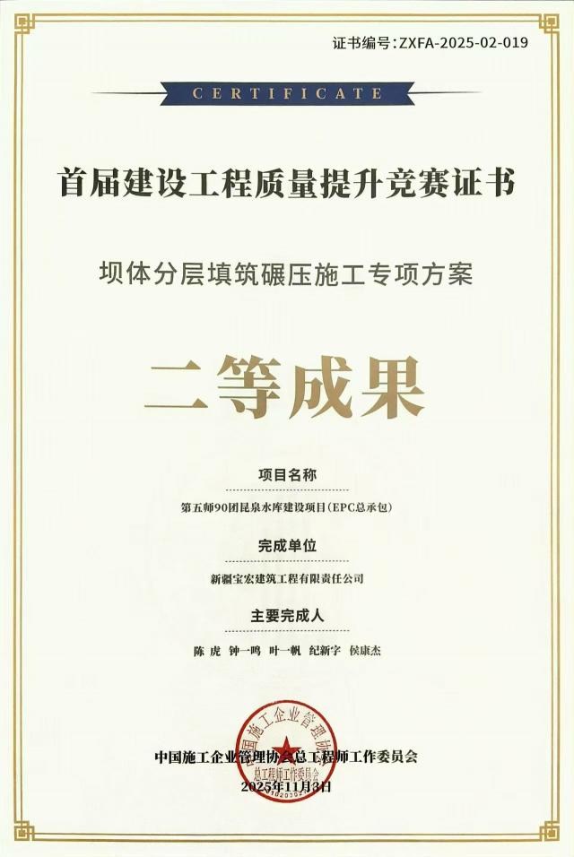 此次竞赛中,双河工建成果覆盖仓储、工业、市政等多工程领域:《浅圆仓滑模安全专项施工方案》(配套中央储备粮阜康直属库仓储项目二期)凭借精准安全管控与工艺创新获评一等成果;《坝体分层填筑碾压施工专项方案》(第五师90团昆泉水库建设项目(EPC总承包))优化了分层填筑碾压的施工工艺,让坝体施工质量更可控、施工效率更优,获评二等成果;《市政道路提升改造关键节点质量策划方案》《硅PU面层施工专项方案》则分别以细节管控、绿色施工技术获评三等成果。