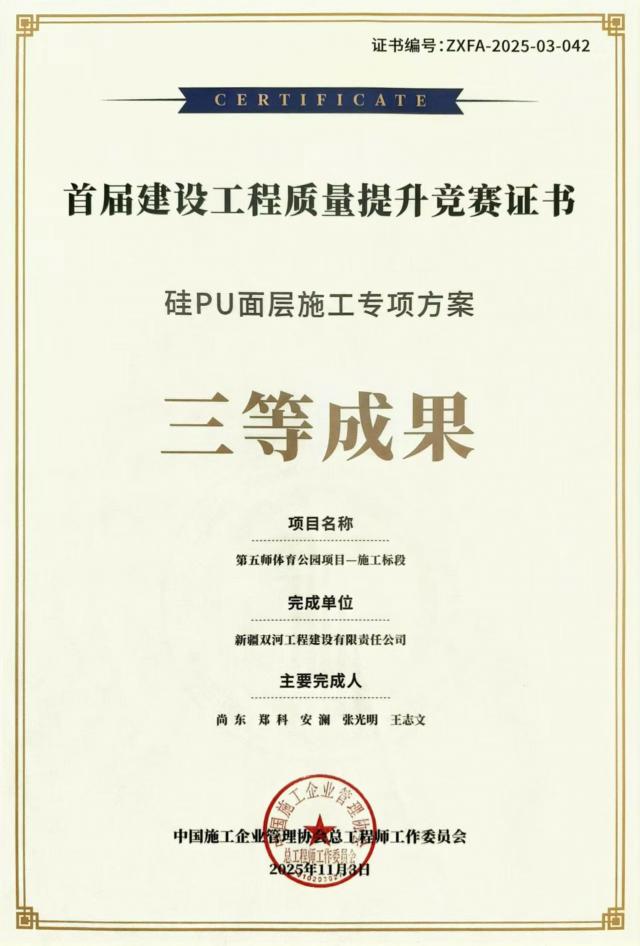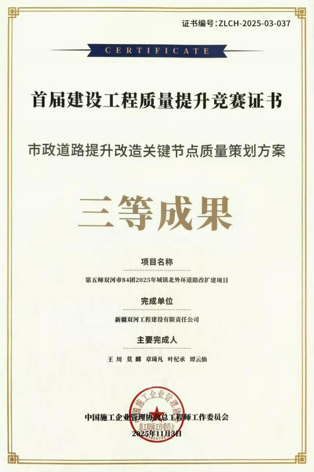 近日,中国施工企业管理协会主办的首届建设工程质量提升竞赛结果正式公布,新疆双河工程建设有限责任公司在全国1274项参赛成果中脱颖而出,一举斩获1项一等成果、1项二等成果、2项三等成果,以硬核实力彰显了企业在工程质量管理与技术创新领域的领先水平。
