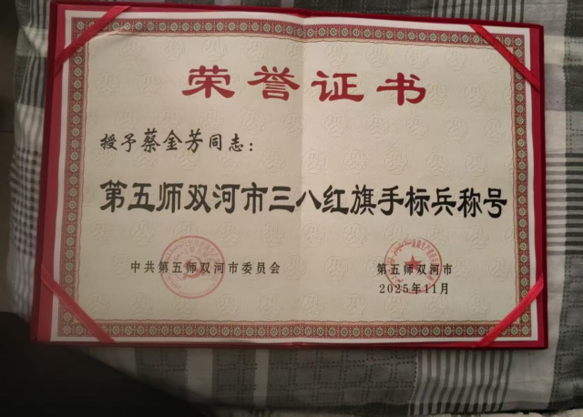 蔡金芳荣获“第五师双河市三八红旗手标兵”称号