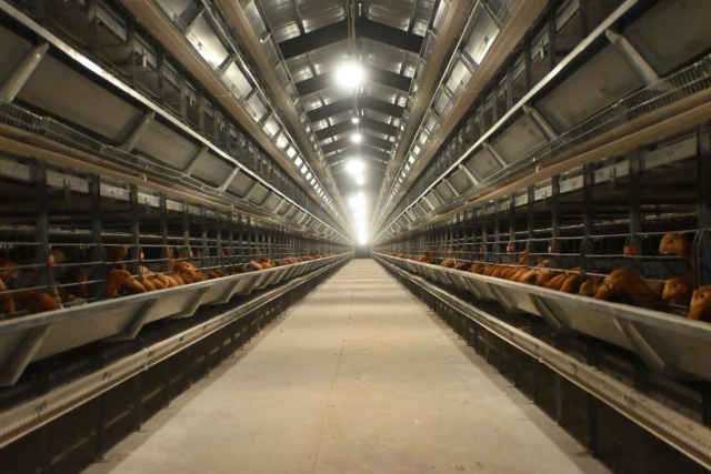 鸡舍内,排列整齐的养鸡设备干净整洁,垫料干燥松软,自动化的养鸡设备定时通风送气,工作人员及时打扫,为鸡苗营造了干净舒适的生长环境。鸡笼内的鸡苗有的相互嬉戏有的正探头觅食,生长状态良好。