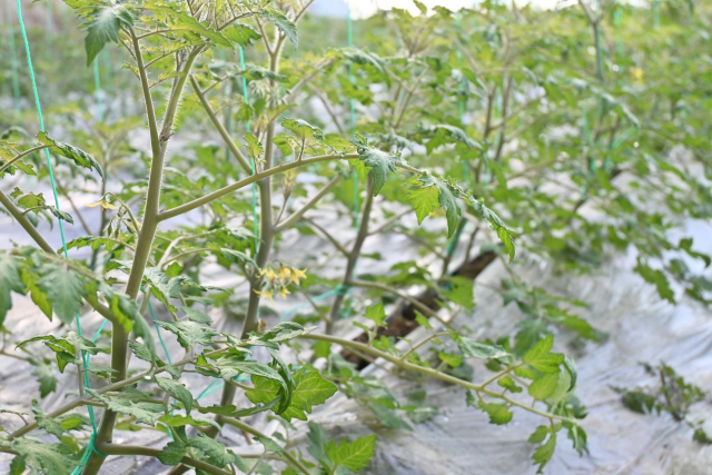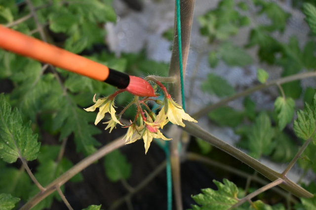 蔬菜大棚内,西红柿苗长势正旺,叶片翠绿,小花苞缀满枝头,一派生机勃勃的景象。工作人员正有条不紊地开展西红柿对花授粉作业,他们用毛刷蘸取调好的营养剂,再轻涂到花蕊柱头上。操作过程中,工人选择晴朗的天气进行作业,授粉的同时摘除病弱花,保证养分集中给健康花朵,为果实品质打下坚实基础。
