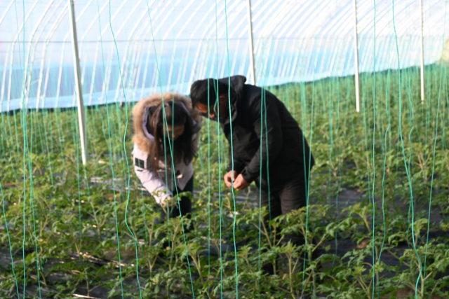 12月10日,八十一团蔬菜大棚绿意盎然,为了让西红柿早日挂果,工作人员开启了人工对花授粉作业。