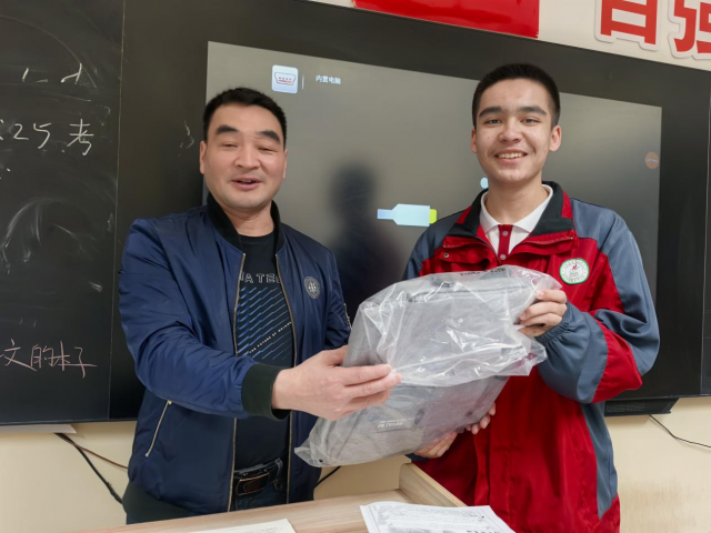 第五师高级中学(黄冈中学第五师分校)援疆教师李建钊向结对学生艾里亚沙·哈木拉提赠送书包。湖北省援疆工作前方指挥部五师工作队提供