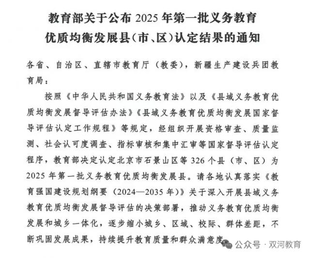 据了解,此次认定严格遵循《中华人民共和国义务教育法》《县域义务教育优质均衡发展督导评估办法》等相关规定,经过资格审查、质量监测、社会认可度调查、指标审核和集中汇审等多轮国家督导评估认定程序,最终确定326个县(市、区)为2025年第一批义务教育优质均衡发展县(市、区)。