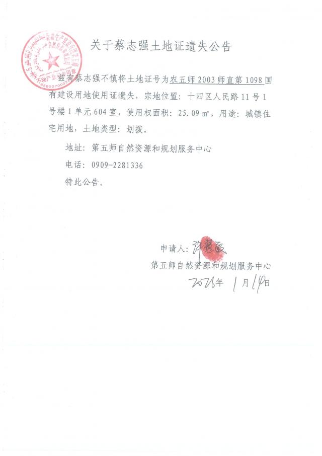 关于蔡志强土地证遗失公告