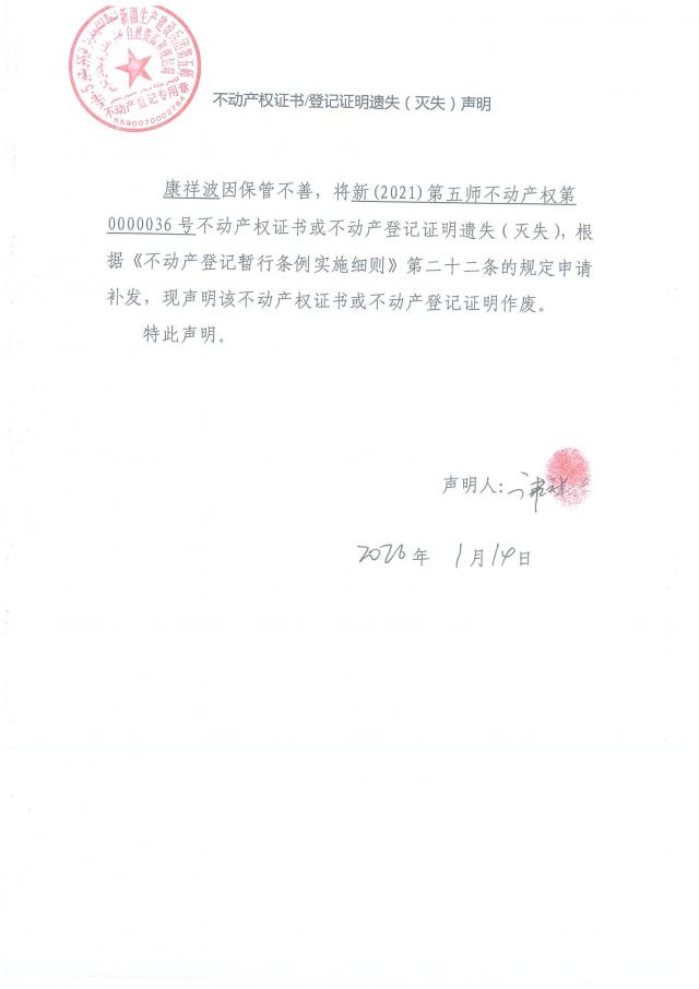 关于康祥波不动产权证遗失公告