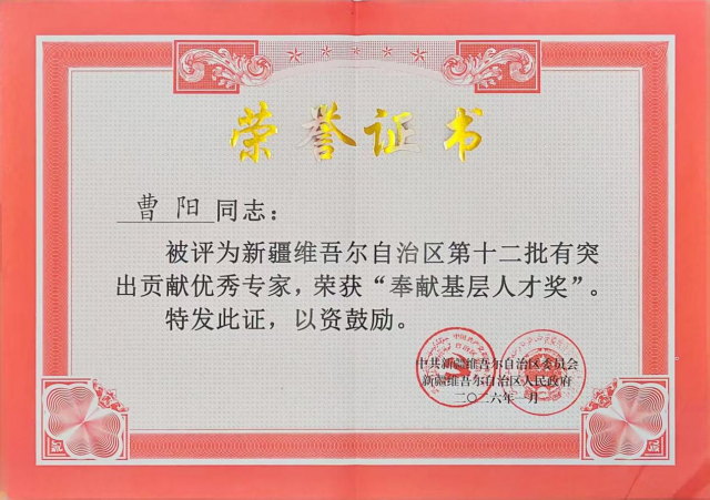 近日,自治区第十二批有突出贡献专家表彰大会在乌鲁木齐隆重举行,受表彰的专家名单揭晓,兵团第五师农业科学研究所所长曹阳获此殊荣。