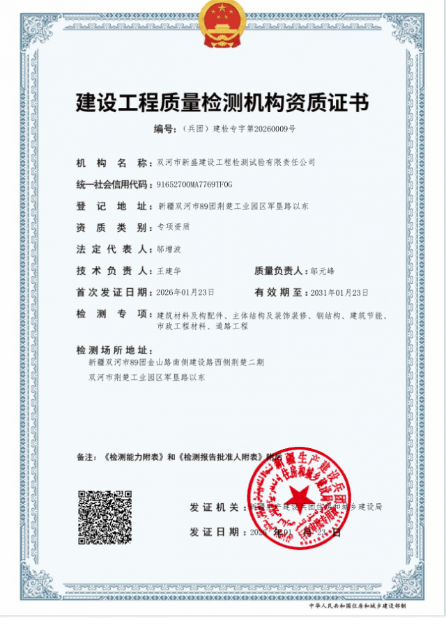 立足新资质,开启新征程。未来,新盛检测公司将充分发挥6项资质的综合优势,为师市各类建设工程提供更有力的技术支撑,在保障工程质量安全、助力兵团建设事业高质量发展的道路上笃行实干,贡献新的更大力量。