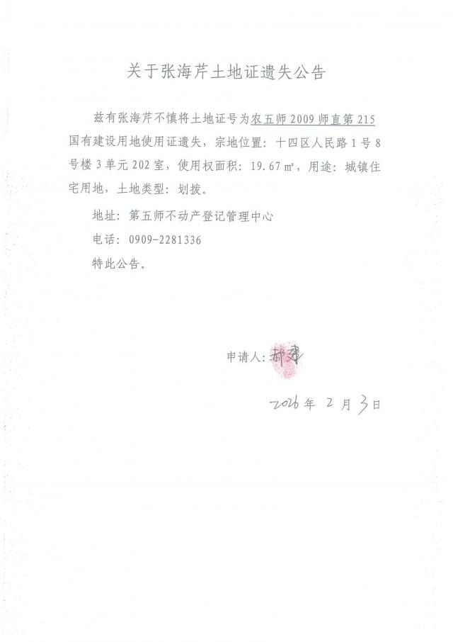 关于张海芹土地证遗失公告