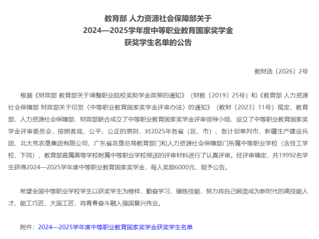近日,教育部、人力资源和社会保障部联合发布《2024—2025学年度中等职业教育国家奖学金获奖学生名单的公告》,全国共有19992名中职学生上榜,第五师双河职业技术学校学生杜麒麟、兰宝强、古丽帕里达艾日麦麦提、丁建勇榜上有名,每人将获得6000元奖学金。