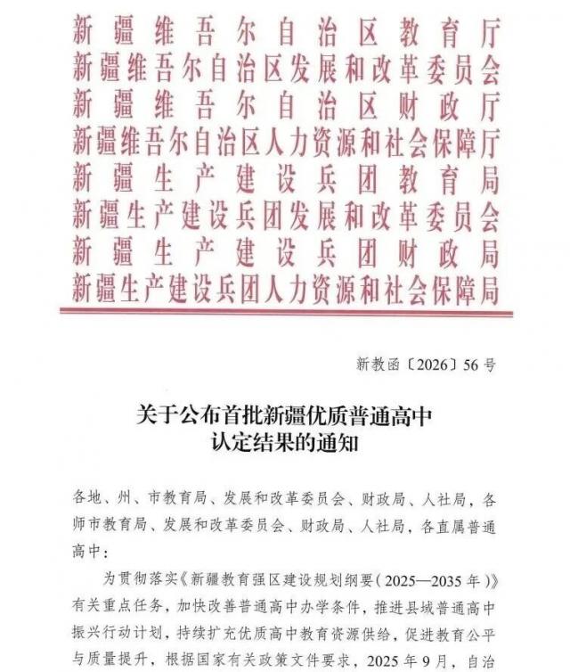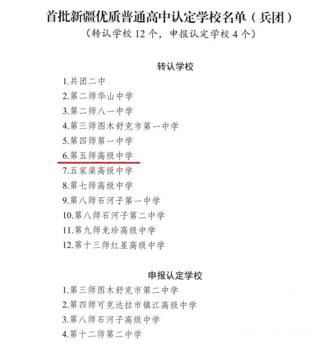 近日,新疆维吾尔自治区教育厅公布2025年新疆优质普通高中认定结果,第五师高级中学成功由兵团示范性高中转认新疆优质普通高中,成为兵团首批获此殊荣的学校之一。
