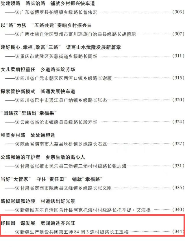 近日,第五师双河市交通系统传来喜讯!交通运输部发布了《“四好农村路”故事—“路长”谈路》出版发行的通知,84团3连村级路长王玉梅同志的先进事迹《纾民困谋发展宽阔通途齐兴旺》,成功收录于此书,由人民出版社出版,全国发行。本书围绕“致富路、幸福路、连心路、振兴路”四个篇章,收录来自全国县、乡、村三级114位“路长”真实、鲜活的事迹故事,生动反映了“路长”们在农村公路助力推进乡村全面振兴中的坚守、担当与创新,既是对广大“路长”辛勤付出的致敬与记录,也为弘扬新时代交通精神提供了生动载体,为推进乡村全面振兴、加快建设交通强国营造了良好社会氛围。