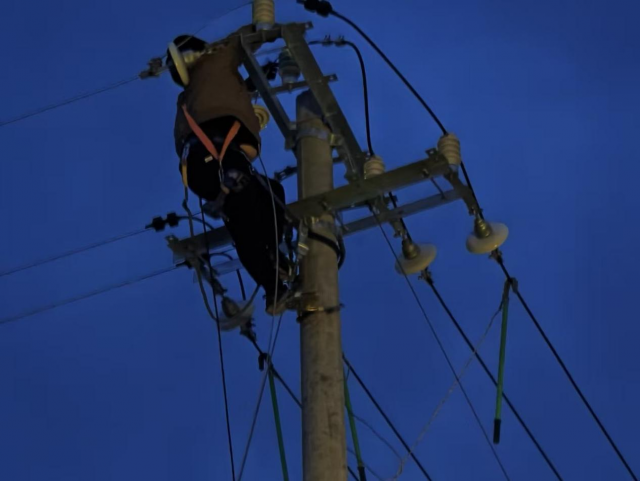 抵达现场后,抢修人员严格执行安全作业规范,经细致勘查,确定故障原因为节日用电负荷激增叠加天气影响,导致该区域架空线路断线,造成周边居民及连队生产生活用电中断。“大家加快速度,务必在最短时间内恢复供电,让乡亲们过个亮堂年!”现场工作负责人一声令下,抢修人员迅速分工,有条不紊地开展现场布置、验电接地、登杆作业。