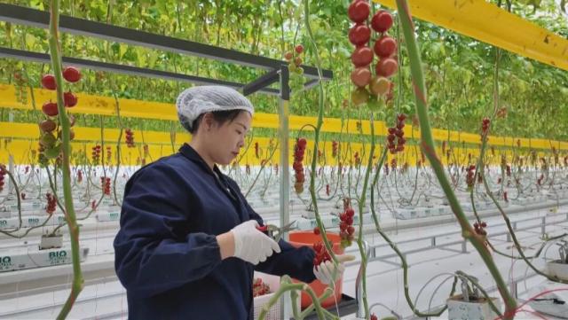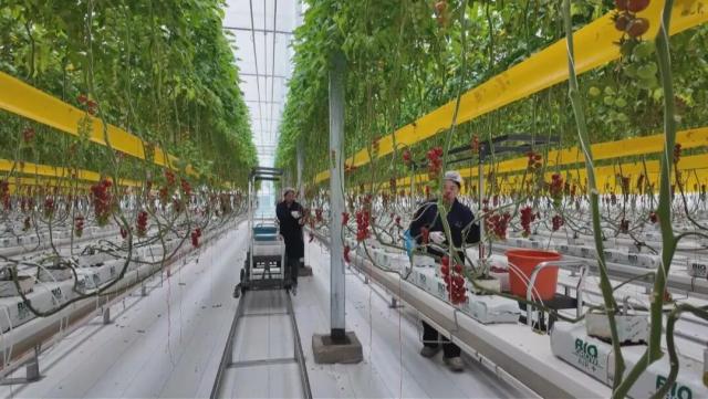 2月13日,记者走进五师双河市80万平方米联栋智能设施农业一期项目现场看到,红彤彤的番茄挂满藤蔓,工人们正熟练地操作采收设备,将一串串优质串番茄有序送入分拣包装线。当前,双河市深莓智能科技有限公司培育的首批串番茄迎来集中采收期。