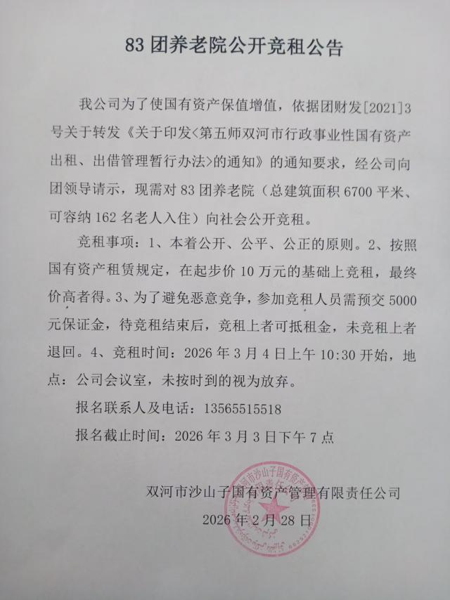 83团养老院公开竞租公告