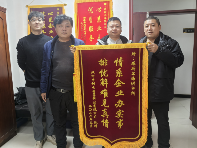 送锦旗现场,企业负责人与供电所负责人亲切握手交谈,细数供电部门在企业用电保障中的点滴付出。“从项目落地到投产运行,每一次用电难题都能得到快速响应和妥善解决,供电所的同志们真是我们企业发展的‘电保姆’!”企业负责人由衷赞叹道。这面鲜红的锦旗,不仅是对塔斯尔海供电所优质服务的高度肯定,更是对供电人坚守初心、履职尽责的最好褒奖。