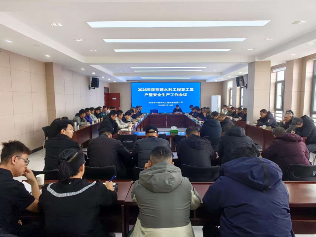 人勤春来早,奋进正当时。为全面吹响年度项目建设“冲锋号”,统筹抓好复工复产、安全生产与党风廉政建设,近日,兴城水利公司召开水利工程项目复工复产暨安全生产廉洁工作会议。公司领导班子、各部门负责人、各项目部及参建单位代表40余人参加会议。会议传达学习了上级关于水利工程复工复产、安全生产及党风廉政建设相关文件精神,通报各在建项目复工计划、人员到岗、设备检修及隐患排查情况,对全年工程建设、安全管控、廉洁自律等重点工作进行再部署、再压实。