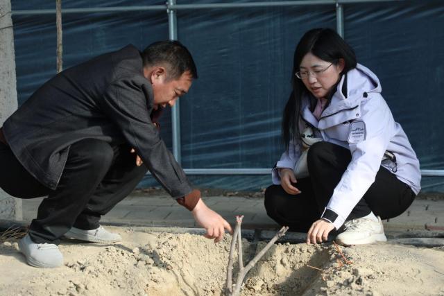 3月25日,三连大棚内温暖湿润,果树抽出新芽,一派生机盎然。葡萄架之间新栽种的无花果树苗已经扎根,工作人员正在查看果树的生长情况,并适时打理葡萄架。