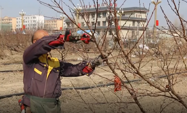 结合修枝,种植户同步清理修剪下的枯枝、落叶,彻底清园减少病虫害源头,再进行浅耕松土。目前,脱防寒衣与修枝工作正有序推进,预计30天左右完成。褪去冬装、经过精细修剪的桃树舒展枝条,嫩芽萌发,桃园里满是春耕生机。